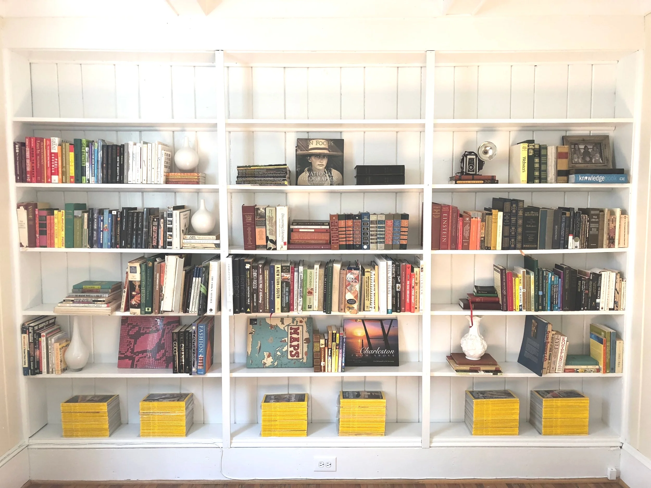 Below is a bookshelf that has 1) books in categories AND 2) books in ROY G BIV order AND 3) enough white space AND 4) meaningful decorative objects displayed. In addition, the three top shelves have been left blank in order to display a collection.